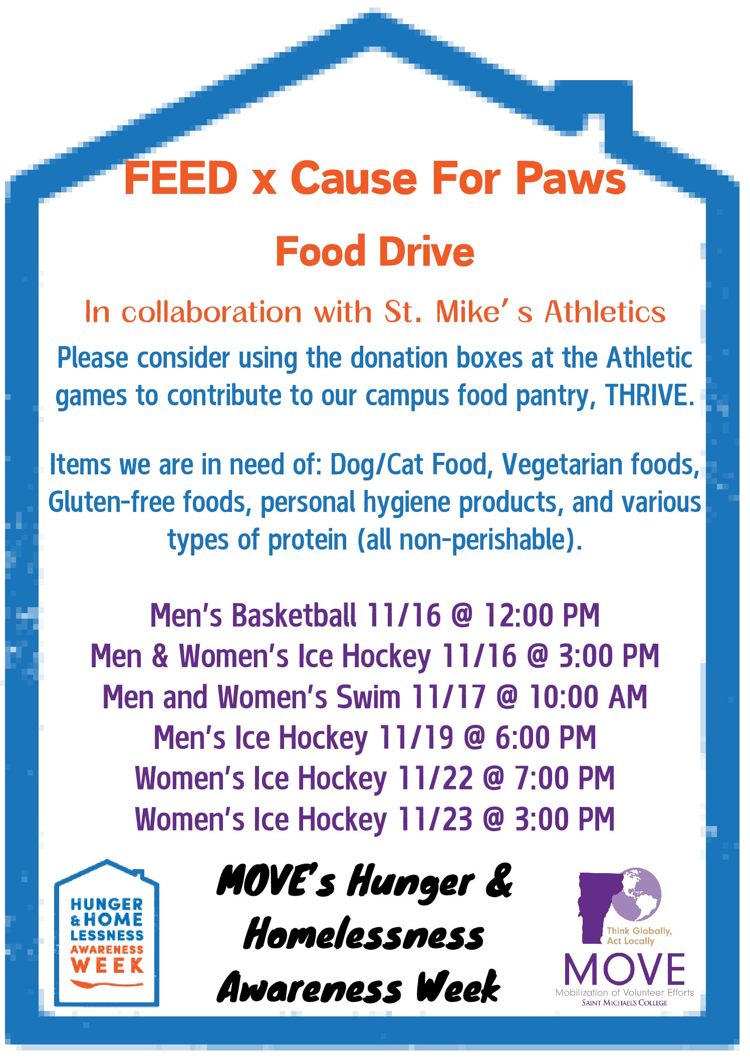 Join in MOVE’s commemoration of National Hunger & Homelessness Awareness Week November 16-23, 2024. All students, faculty, staff, and alumni are invited to attend SMC athletics home games and bring an item or two for donation to support our campus community through the college’s food pantry, THRIVE. THRIVE is in need of cat & dog food for campus pets, and non-perishable food items: vegetarian foods, gluten-free foods, non-perishable types of protein, and hygiene items.