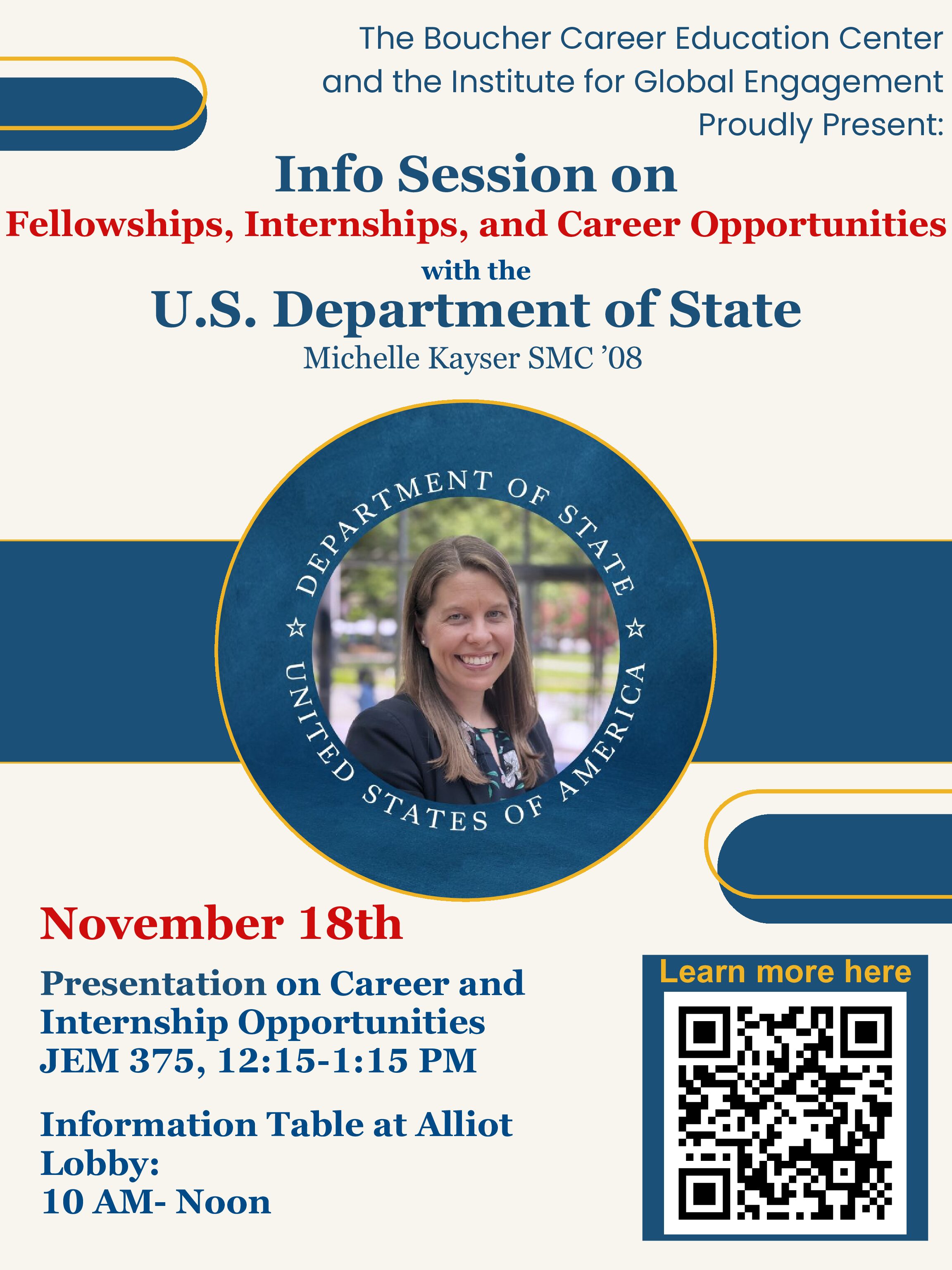 Come to an info session on fellowships, internships, and career opportunities with the US Department of State, featuring Michelle Kayser (SMC ’08).