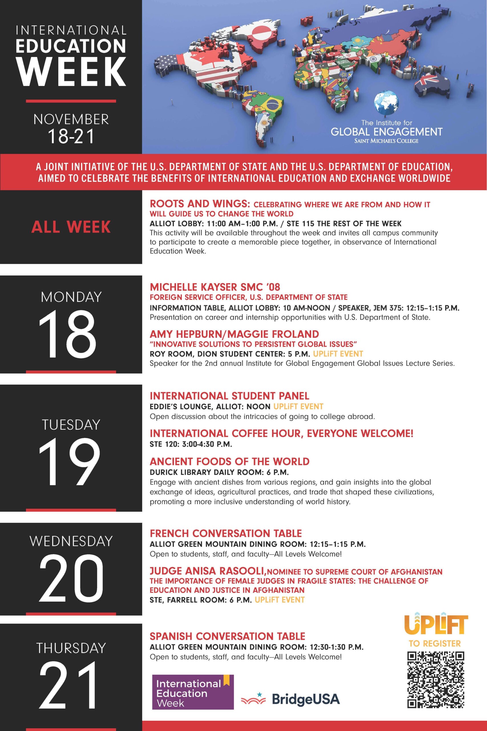 Saint Michael’s College and the Institute for Global Engagement celebrate International Education Week 2024, recognizing the benefits of international education and exchange for all of the members of our extended campus community. There are a variety of great events to choose from if you are on campus or in the greater Burlington, VT area to share in the IGE’s efforts to advance global citizenship, cross-cultural understanding and human connection.
