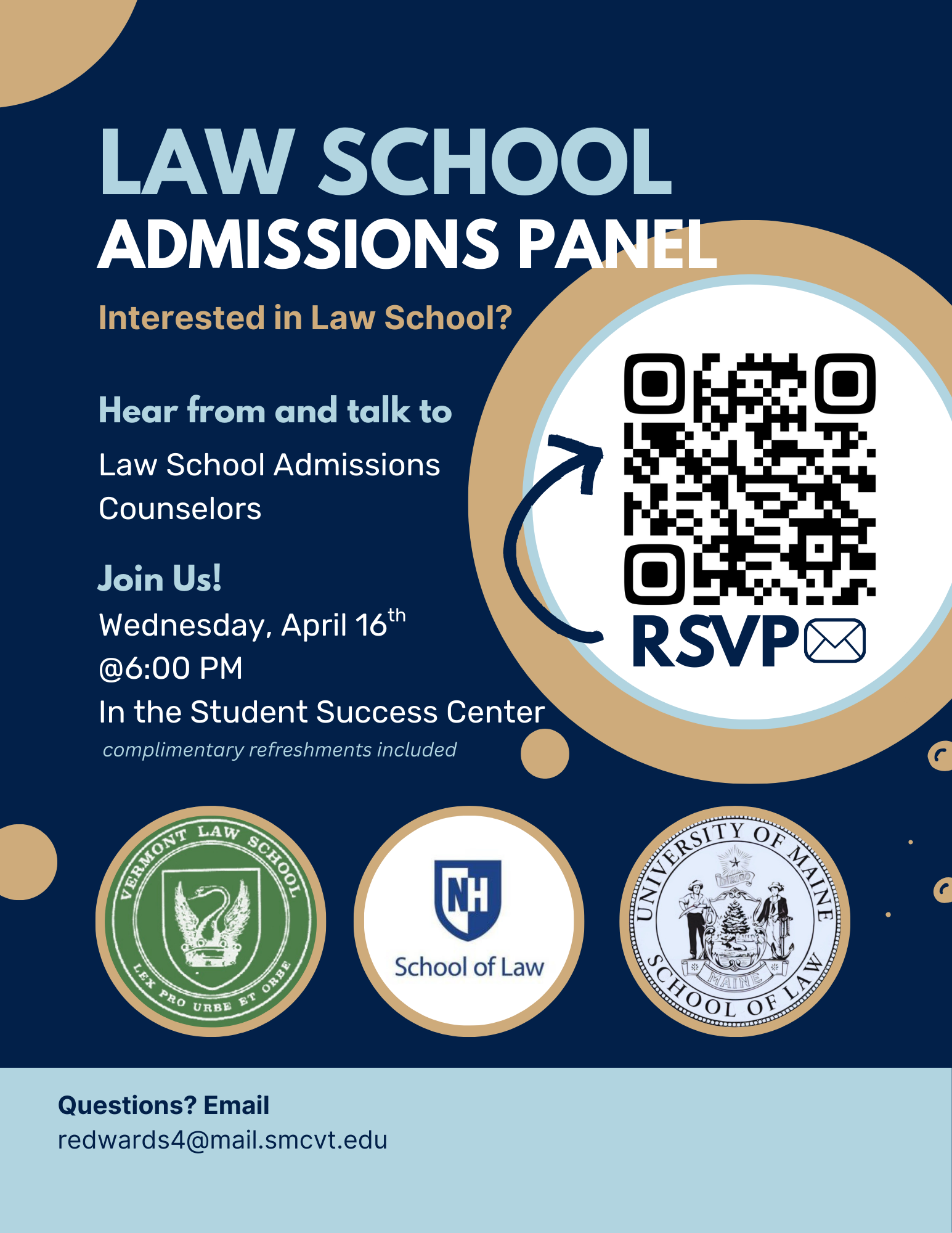 The Pre-Law Society is hosting three Law School Admissions counselors from UMaine Law, UNH Law and Vermont Law. This is a phenomenal opportunity for anyone considering applying to law school post grad or down the road to learn about the application process and ask questions. If interested please fill out the google form on a poster around campus or click on this link.