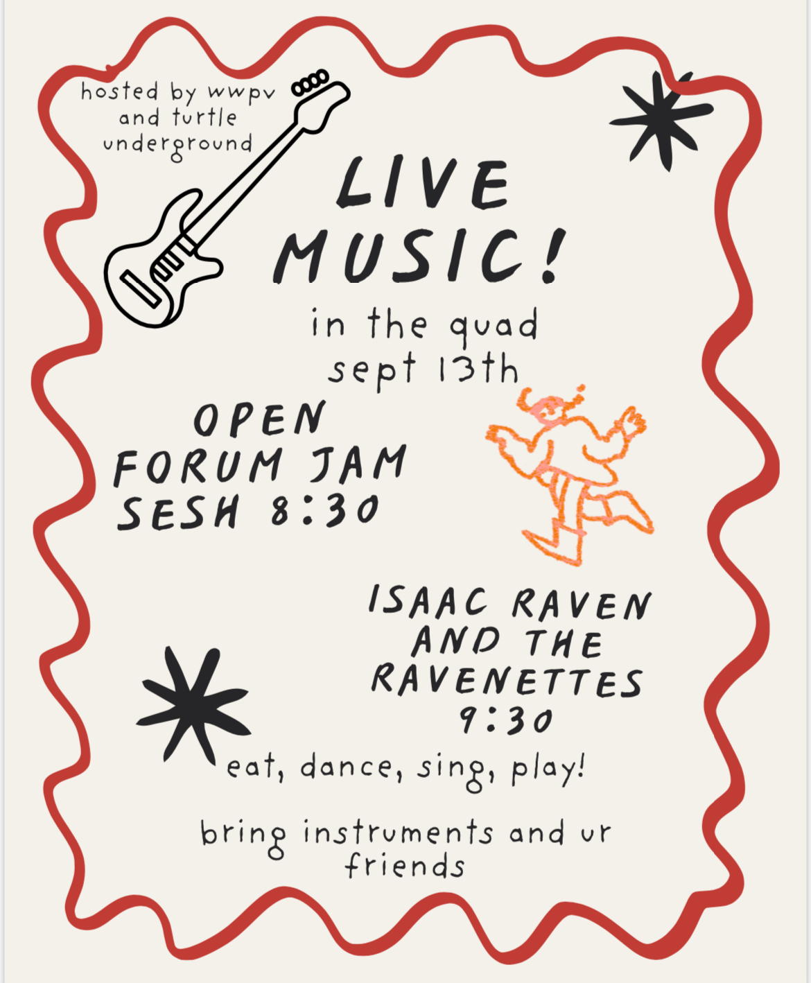 Saturday, September 13th WWPV and Turtle Underground will be hosting a live jam session at 8:30pm followed by a band at 9:30pm. If you are musically inclined, or want to try something new, please join us at 8:30! If you want to listen to live music, please come as well. There will be food, music, and a great time! Located in the Quad.