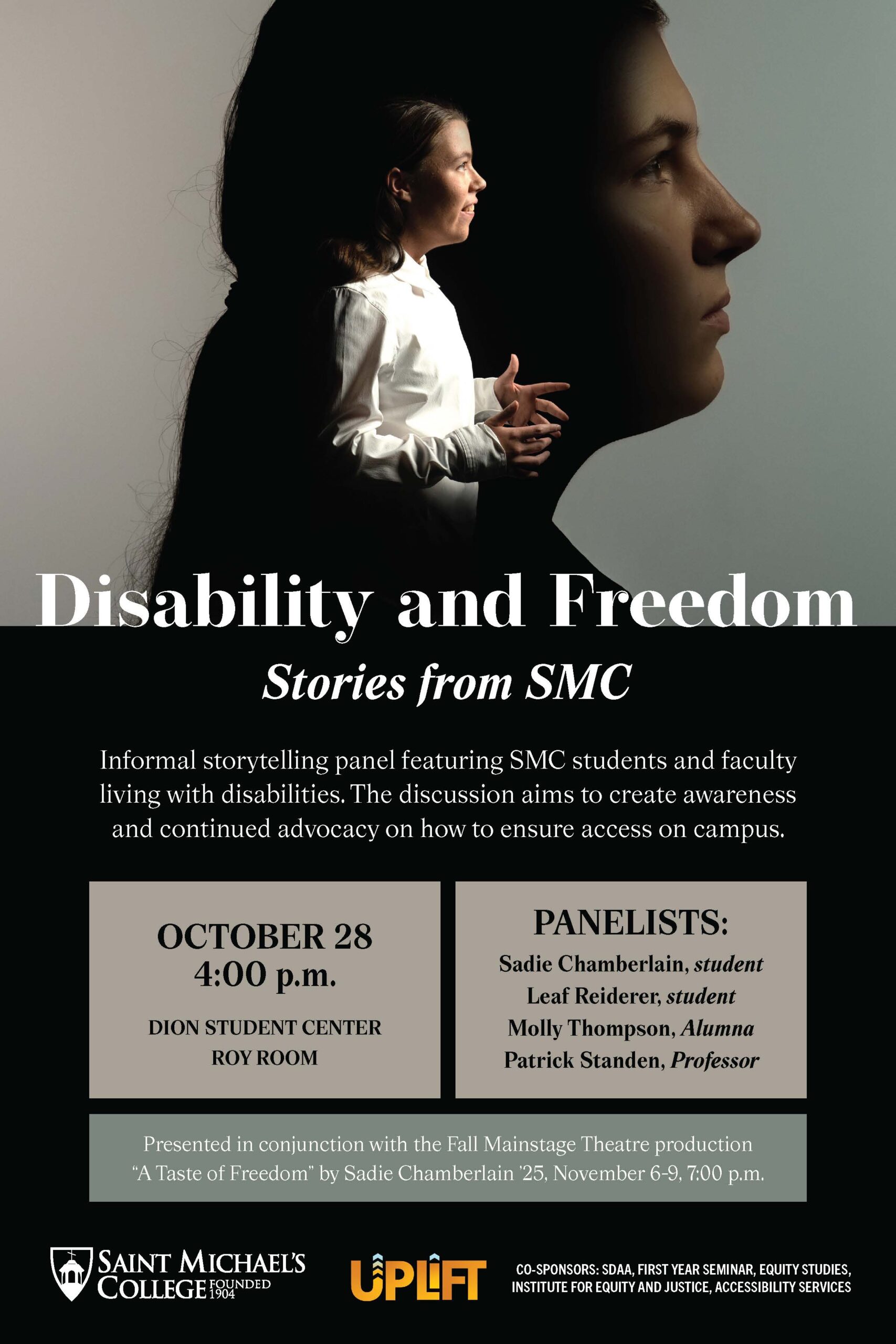 This panel will explore the perspectives of four individuals who identify as having a disability and have worked or lived on our campus. Panelists include Leaf Reiderer ’26, Sadie Chamberlain ’25, Molly Thompson ’23, and Professor Patrick Standen. This presentation was created to serve as an introduction to the fall Theatre production “A Taste of Freedom” by Sadie Chamberlain.