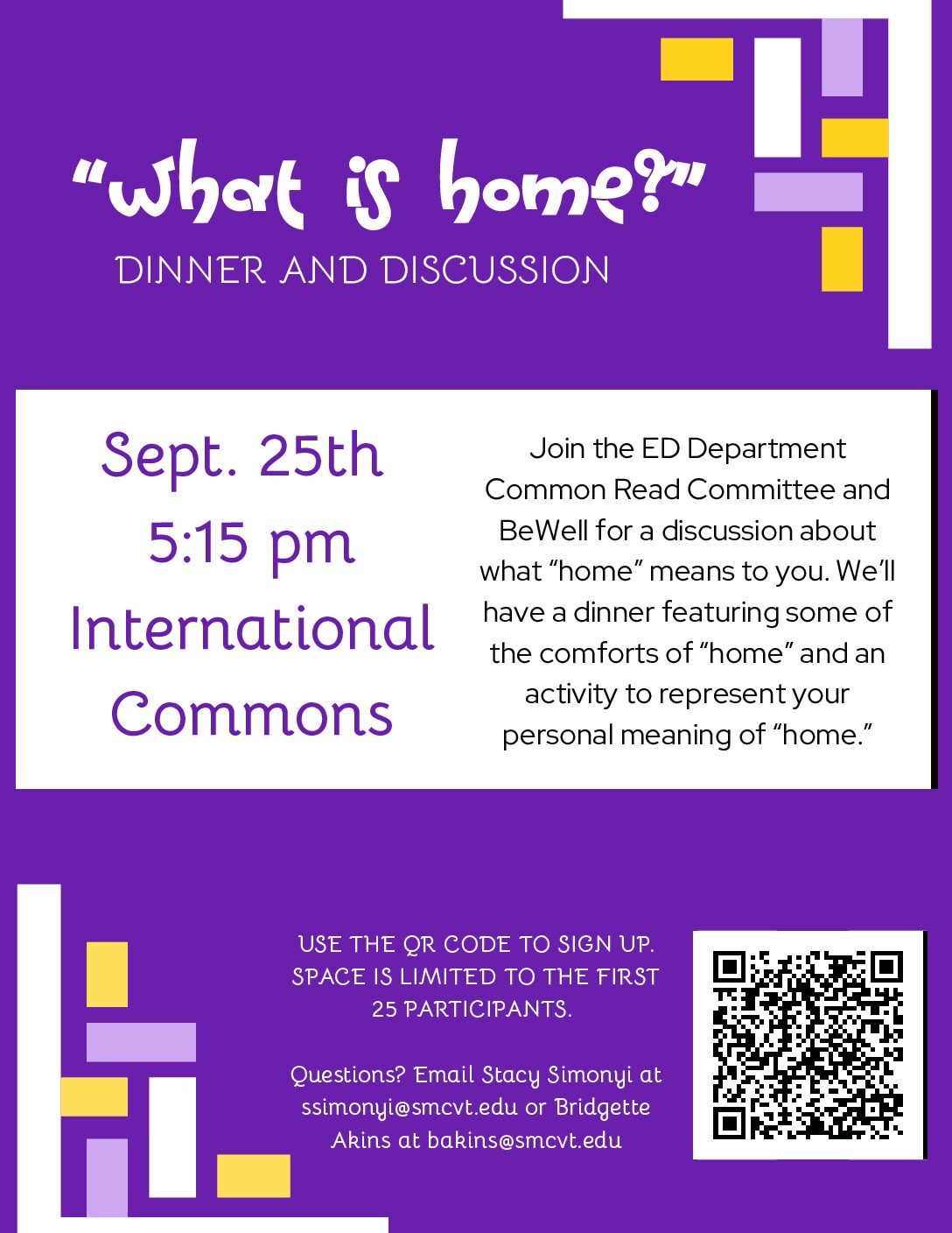 Join the ED Department Common Read Committee and BeWell for a discussion about what “home” means to you. We’ll have a dinner featuring some of the comforts of “home” and an activity to represent your personal meaning of “home.”