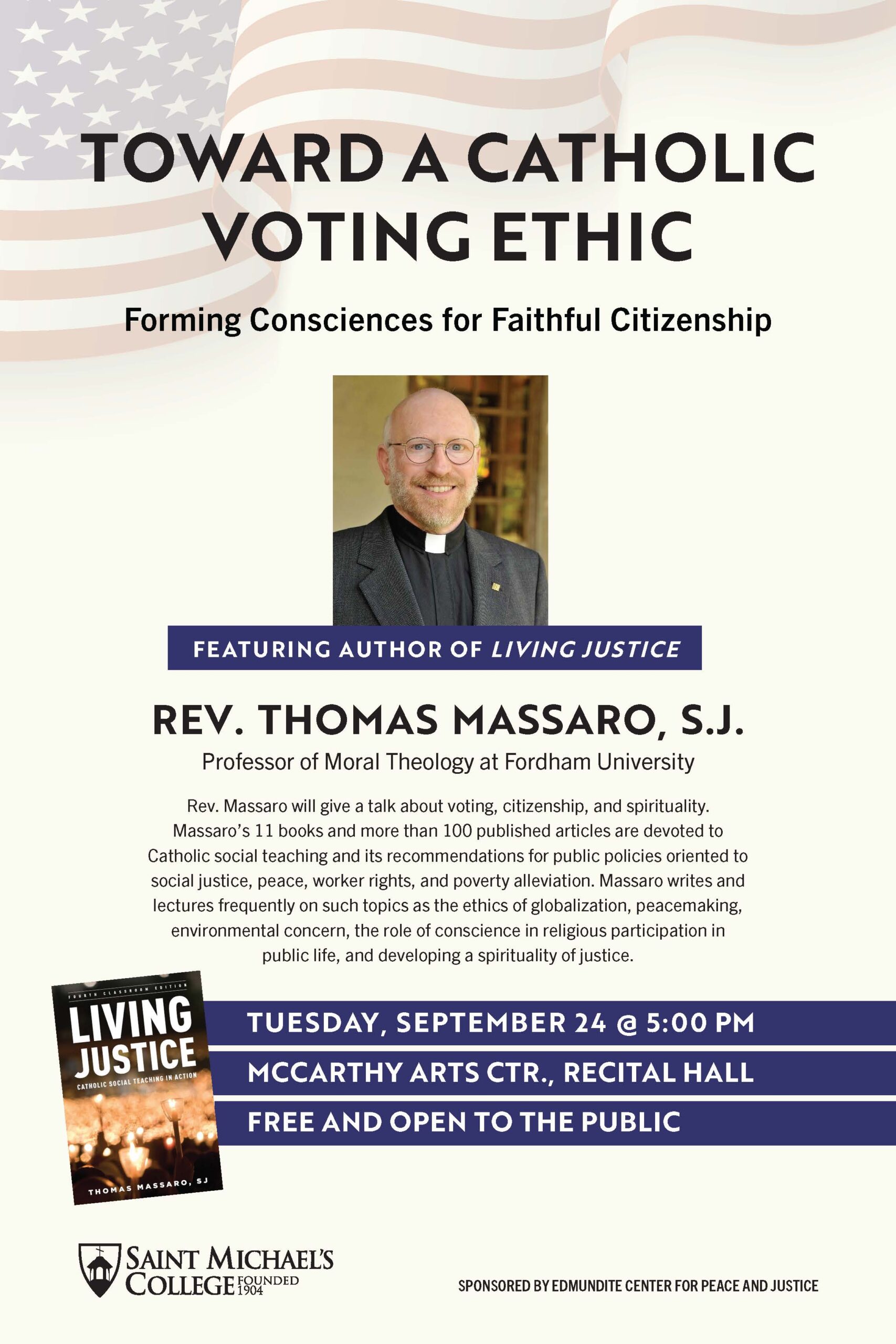 Thomas Massaro, S.J. will deliver a lecturer titled “Toward a Catholic Voting Ethic: Forming Consciences for Faithful Citizenship” on Tuesday, September 24, 2024, at 5:00 p.m. in the Recital Hall of the McCarthy Arts Center. Thomas Massaro, S.J., is Professor of Moral Theology at Fordham University. A Jesuit priest of the East Province, he served as professor of moral theology at Weston Jesuit School of Theology in Cambridge, Massachusetts, at Boston College, and at Jesuit School of Theology of Santa Clara University, where he also served as Dean. Six years after his arrival at Fordham, he was awarded the McGinley Chair of Religion and Society in 2024.