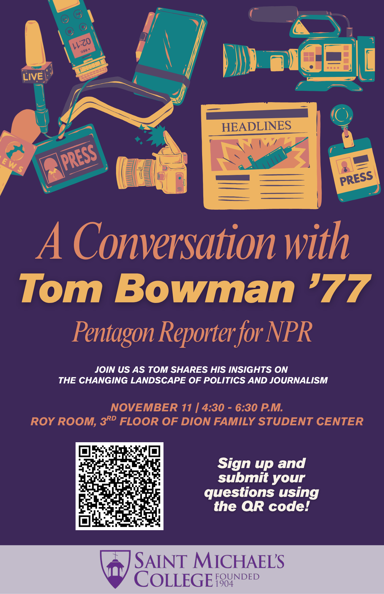Join us in welcoming NPR Pentagon reporter Tom Bowman '77. Tom will speak about his experience being one of the first journalists on the scene at the Pentagon on 9/11, and how media access and reporting have evolved in the years since. Light refreshments and cider donuts will be served. <!-- If you embed multiple […]