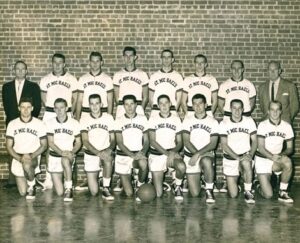 Caption: The 1957–58 “Iron Knights” Hall of Fame basketball team has lost three more members within the past year. Their legendary season will live on in St. Mike’s lore. Back row, third from left, Dave Mracek (Class of 1959); second from right (next to Doc Jacobs), Jim Browne (Class of 1960); front row, fourth from right, Ralph St. Peter (Class of 1959).