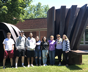 Students from the ASC Excell class stand near a campus sculpture at Lyndon State College (now Northern Vermont University Lyndon campus) with their Professor Karen Popovich (third from right in purple shirt).