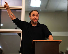 Alex Lawson speaks in the Farrell Room at Saint Michel’s College on December 4. (photos by Danielle Joubert ’20)