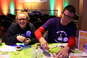 Professor David Heroux of the Saint Michael’s College chemistry faculty and the Green Mountain area coordinator for the American Chemical Society, led the event on October 26 and 27 in honor of National Chemistry Week. This year’s theme is Marvelous Metals. “National Chemistry Week is designed to highlight the importance of chemistry in people’s lives,” said Heroux. He added that chemistry is important in the everyday mechanics of life, whether we realize it or not. One of his many goals for the weekend was to bring awareness to science and its active role in our lives, and he achieved this by collaborating with student volunteers from the College’s Chemistry Club to create safe and enjoyable chemical experiments to engage young learners about science.