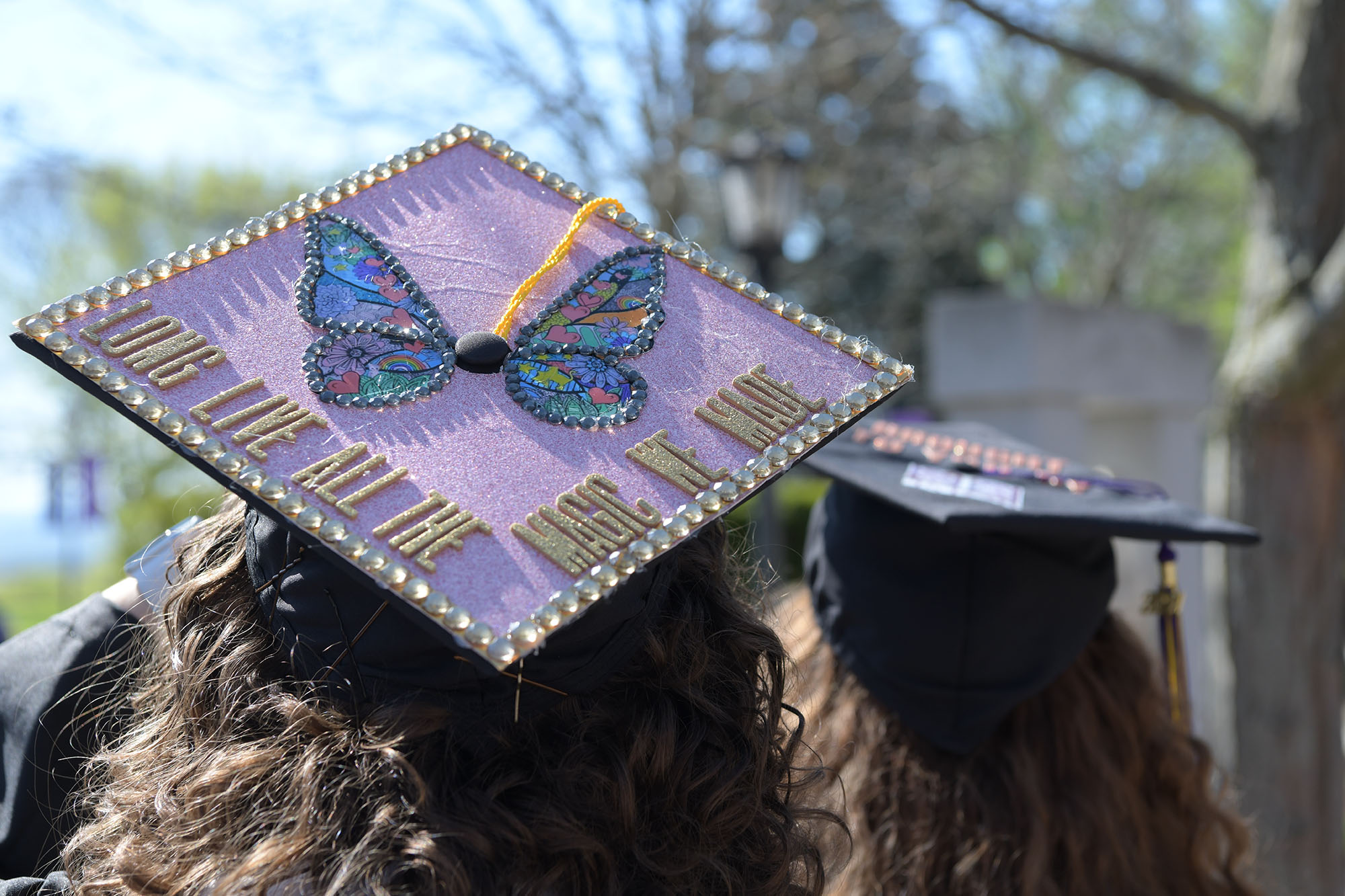 The graduates’ perseverance through a pandemic was a recurring theme in remarks from speakers at the two nearly identical 90-minute ceremonies. The first 10 a.m. morning “Gold” Ceremony for the Thursday, May 13 Commencement was for those receiving bachelor of arts degrees, while the afternoon 1 p.m. “Purple” Ceremony was for bachelor of science and master’s degree recipients.