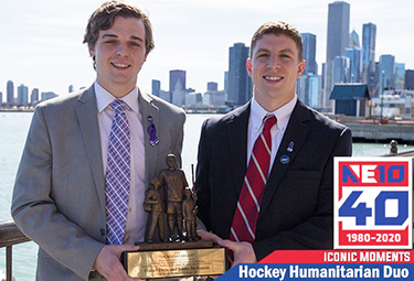 Not only were Divis and McKenzie were the first Purple Knights to win this award, but also two out of four total of the non-Division 1 award recipients. In 2017, the duo also appeared live on ESPN during the NCAA Men’s Frozen Four to present HHH and discuss its mission, their goals, and the stigmas surrounding mental health. They also threw the first pitch for a Boston Red Sox game in the summer of 2017. Additionally, they worked with college athletic communications professionals during the 2018 Eastern Athletic Communications Association workshop in Burlington. The exposure and networking led to HHH becoming the national organization that it is today..