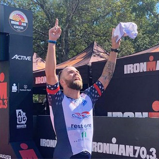 Triathlete Dan Du Feu ’18 at the end of a race.