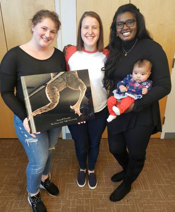 Kelsie Miller ’16, center, with Hannah Vigran (second listed author on the recently highly publicized paper, and Nirosha Murugan (first author) from Kelsie’s time at Tufts. The large photo behind the headline shows Kelsie doing fish research on a boat on Lake Champlain during her St. Mike’s student days.