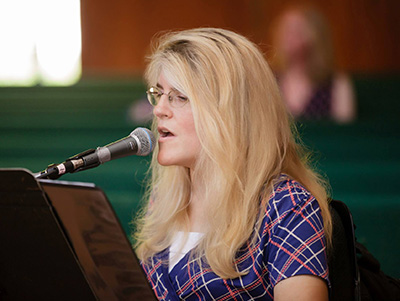 Singing is a passion for Maria Rinaldi ’00 of the Saint Michael’s Admission Office. The large photo behind the headline of this story shows Maria directing the Freedom & Unity Chorus that she founded, during a pre-pandemic concert in the College chapel.