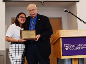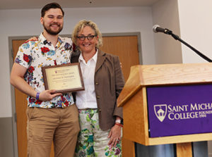 O’Malley citation text: I am honored to present this 2022 Rev. Gerald E. Dupont Award to graduating senior Dan O’Malley. Dan has a long list of accomplishments and activities through which he has demonstrated the ideals of courage, vision, devotion, and faith upon which Saint Michael’s was founded. Dan has put his Catholic faith into action in a variety of ways in serving our campus community and the greater communities of Burlington and his hometown of Syracuse, New York. On campus, Dan has been a committed faith leader in a variety of Edmundite Campus Ministry programs including leading several retreats and witnessing to his faith journey in a series of talks.