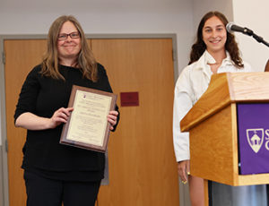 Citation text: “It is an honor to be asked to present this annual award named for my father, whose birthday – by coincidence — is today. He would have turned 113 years old today. I would ask Sarah Knickerbocker from the class of 2022 to please come forward. She is majoring in media studies, journalism, and digital arts with a minor in art and design. Sarah is passionate about creative expression through photography, social media, marketing, and graphic design.