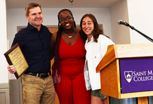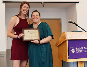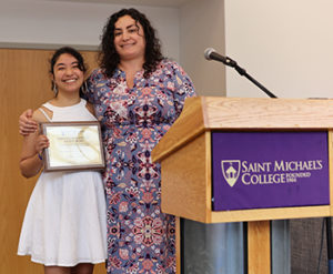 Pangborn and Mackin citations text: “These awards are named for former president of the college, Rev. Gerald E. Dupont, SSE. These award recipients demonstrate dedication to the ideals of courage, vision, devotion and faith upon which Saint Michael’s College was founded. They are given in recognition of outstanding contributions to the Saint Michael’s community. This year’s faculty recipient of the Dupont Award is Professor Greta Pangborn. A professor of Computer Science and the co-director of the Engineering program, the brilliant Professor Pangborn is being recognized by the Class of 2022 for her supportive and accessible approach to teaching.