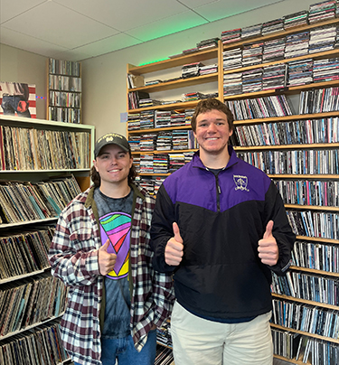 Robert Dwyer ’23, left, with Connor Torpey ’23, in the WWPV record and CD collection room in behind the Dion studio.