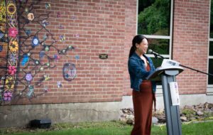 One year after the creation of a community mural called “Power and Joy in Access to All Stories,” Saint Michael’s College community members returned to the mural site to hear from Jason Chin, one of the authors quoted in the artwork.