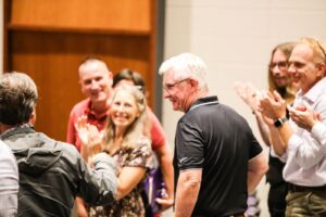 Professor Paul Olsen of the Business Administration and Accounting Department walks on stage to be honored during the 2023 Academic Convocation on Sept. 15, 2023. (Photo by Alex Bertoni)