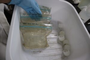 Bags in an experiment by Shannah Weller ’26 contain microcosms of water from Vermont waterways mixed with algae harvested from other Vermont waterways. (Photo courtesy of Shannah Weller)