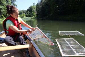 Shannah Weller ’26 checks on algae-spiked water samples incubating in Gilbrook pond for her summer research project, testing whether algae can be used to clean nutrient-polluted water. (Photo by Clay Williams)