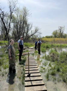 Already the newly assembled walkway has been slightly flood tested when the gage station on the Winooski River peaked at 11’ and water backed up through the beaver pond, into the wetland, and over the walkway. All sections remained in place! With our currently saturated soils, we are just a summer storm away from a more significant flood and I am confident that our work will pass muster. Participants handled sledge hammers, cable cutters, cable crimps, rebar, screw guns, and a lot of lumber. Our group included employees from many corners of campus and a sledge hammer wielding student! Work of this scale requires either a contractor or a small army of committed volunteers. We went with the latter and we are extremely grateful for all of your energy, enthusiasm, and commitment to the Natural Area and to Saint Michael’s College.”