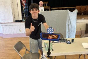 Elijah Phelps ’29 poses next to the timer clock at a competition he helped organize in Ashfield, Massachusetts, in August 2025. The solve’s time (3.20) is his personal record for the Rubik’s Clock event. (Photo courtesy of Elijah Phelps)