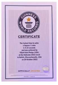 Almost a year after beating the Massachusetts state record for Square-1, Phelps shattered the world record for the same event by just one-hundredth of a second in November 2022.