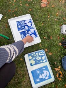The teaching garden has been living up to its name, providing a tangible space for students to make their own connections to the course literature. Inspired by their readings from the 1843 British Algae book, students made their own “cyanotypes” (see photo below).
