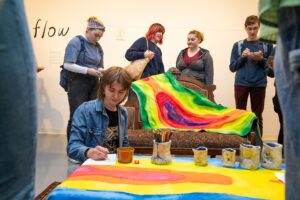 Students interact with the McCarthy Art Gallery exhibit “We Are The Weather” in 2023. The exhibit included the creations of Seattle-based artist Vaughn Bell, who often works in the public art sector to create collaborative projects that frequently focus on our watershed and ecology. (Photo by Cat Cutillo)