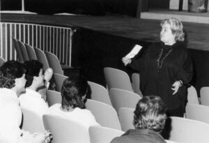 Fine Arts Professor Joanne Rathgeb addresses a group of students seated in the McCarthy Arts Center Mainstage Theatre during the 1980s. (Saint Michael’s College Archives)