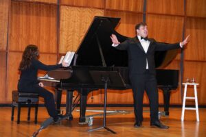 Sean Michael Plumb, son of Saint Michael’s College’s 18th President Richard Plumb, gives an opera performance during his father’s inauguration weekend in fall 2024. (Photo by Steve Mease)