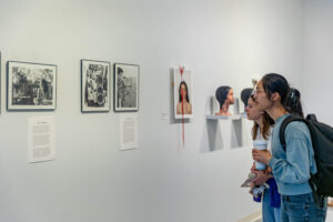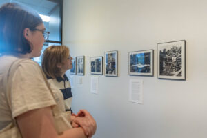 McCarthy Art Gallery visitors view photographs created by Callie Boisvert ’27 as part of a grant-funded summer research project. (Photo by Sophie Burt ’26)