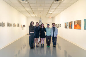 Five Saint Michael’s College students were funded through summer research grants to produce art that was on exhibit in the McCarthy Art Gallery. From left, Chloe Brown ’27, Abbey Gyurko ’27, Callie Boisvert ’27, Eden Milczanowski ’27, and Evan Kennedy ’26 on the opening night of the exhibit. (Photo by Sophie Burt ’26)