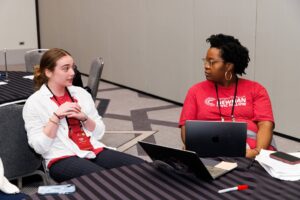 Libby Rossi ’26 (left) speaks to another conference attendee during the Convening of Fellows event in Chicago in October 2025. (Photo courtesy of Libby Rossi)