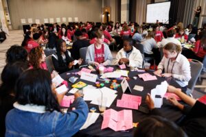 Libby Rossi ’26 (right) works with other Newman Civic Fellows during the Convening of Fellows event in Chicago in October 2025. (Photo courtesy of Libby Rossi)