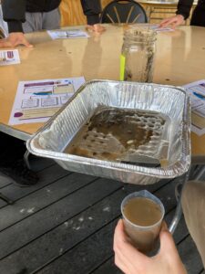 We worked with the 9th grade science team to bring the entire grade to Saint Michael’s in order for them to get hands-on, space based learning experiences in our natural areas! Across the two days, around 240 9th graders, as well as about 10 teachers from the high school visited the campus! The students were split into groups, half of the kids starting on the Farm and the other half heading down into the Natural Area, and then the two groups swapped. While in the Natural Area, the students learned about floodplains and their importance to the environment and Lake Champlain. The group was split further, one team staying at the teaching pavilion, and the other team walking deeper down the trails to actually see the floodplain and make observations about the vegetation. This team was led by George and had special guest speakers along the trails, like our Eco-restoration students and professors Declan McCabe and Trevien Stanger. The other team of students stayed at the teaching pavilion to take part in a filtration simulation, led by graduate assistant Julie. The students used mason jars, rags, and muddy water, to simulate the way a healthy floodplain filters water on its way to the lake. They took notes and made observations to have further discussions with the walking group in their science classes back at school!
