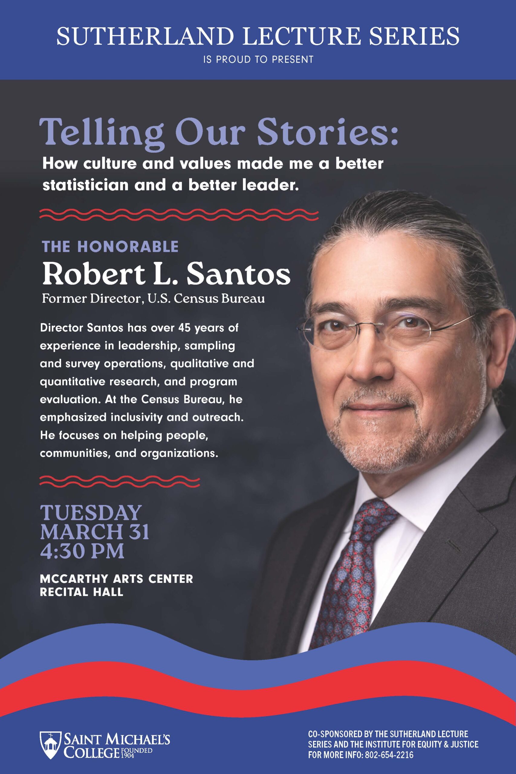 The Sutherland Lecture Series is Proud to present the Hon. Robert L. Santos, Former Director of the U.S. Census Bureau. Director Santos’s talk is titled “Telling Our Stories: How culture and values made me a better statistician and a better leader.”